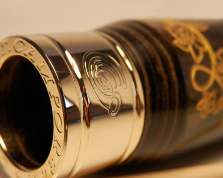 Le lavorazioni di questo pezzo unico di una serie limitata (apertura 8) sono le stesse del modello Infinito in ebanite: stessa camera, facing e baffle. Per essere un’imboccatura scura, il modello Infinito è timbricamente molto ricco, con molta presenza e un’ottima proiezione. Il pregiatissimo e selezionato materiale da cui è ricavato ha caratteristiche acustiche particolari: in esso si fondono la brillantezza e la pronta risposta in termini di vibrazione dell’ebanite, alla complessità timbrica dell’hard rubber (contenente più rubber rispetto all’ebanite standard). Ricavato sempre dalla barra piena e finemente lavorato a mano, dalle finiture interne alla lucidatura esterna. L’anello di rinforzo è in bronzo placcato oro 24 kt.